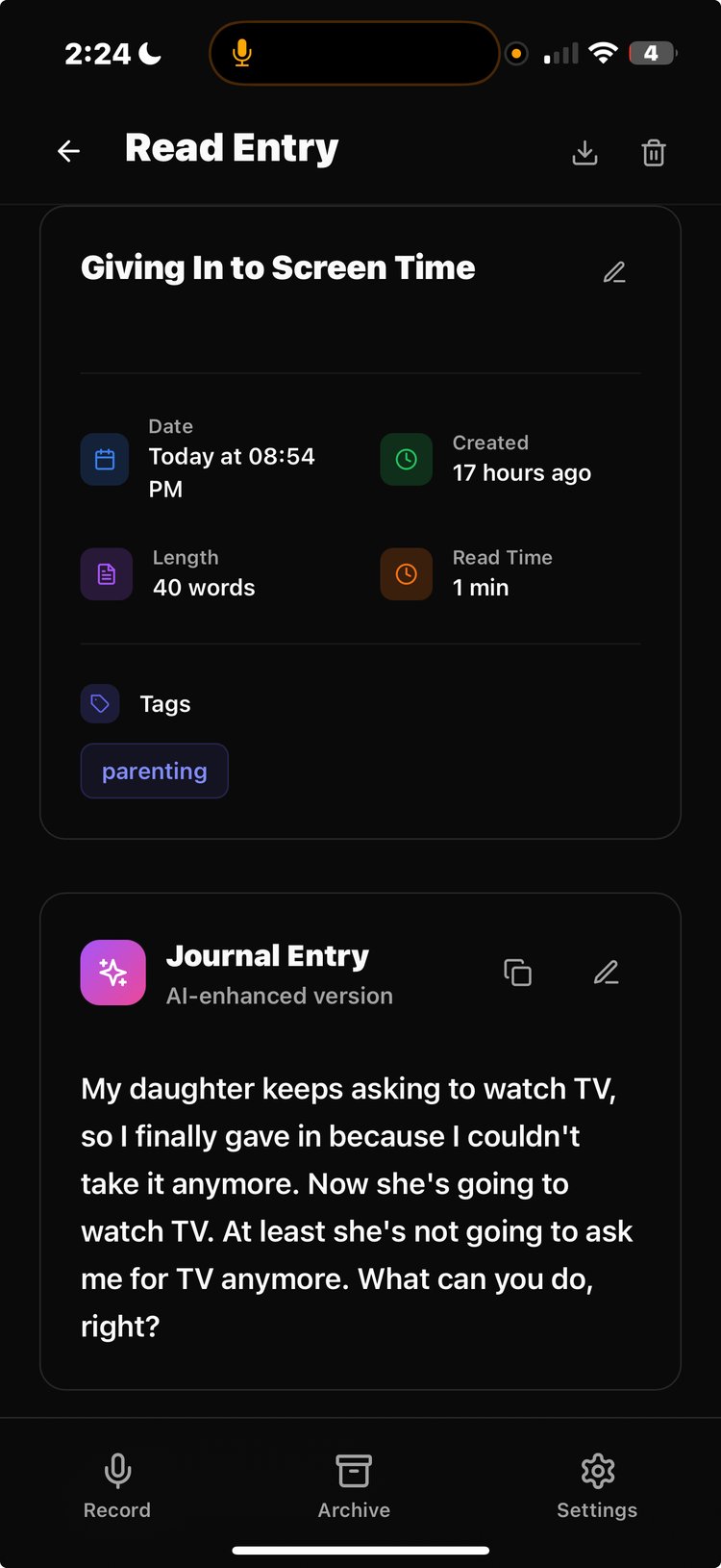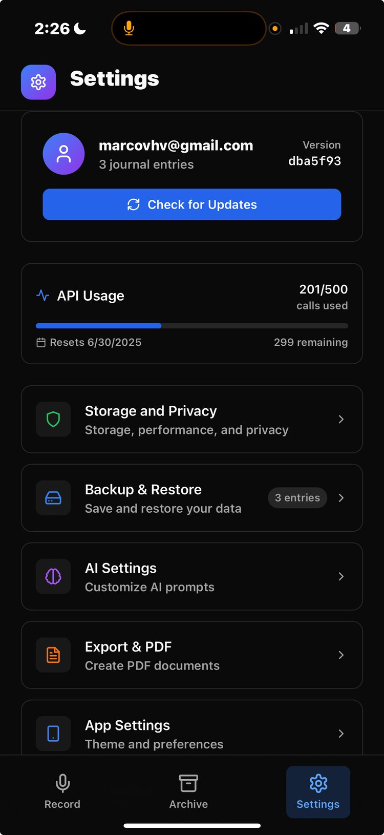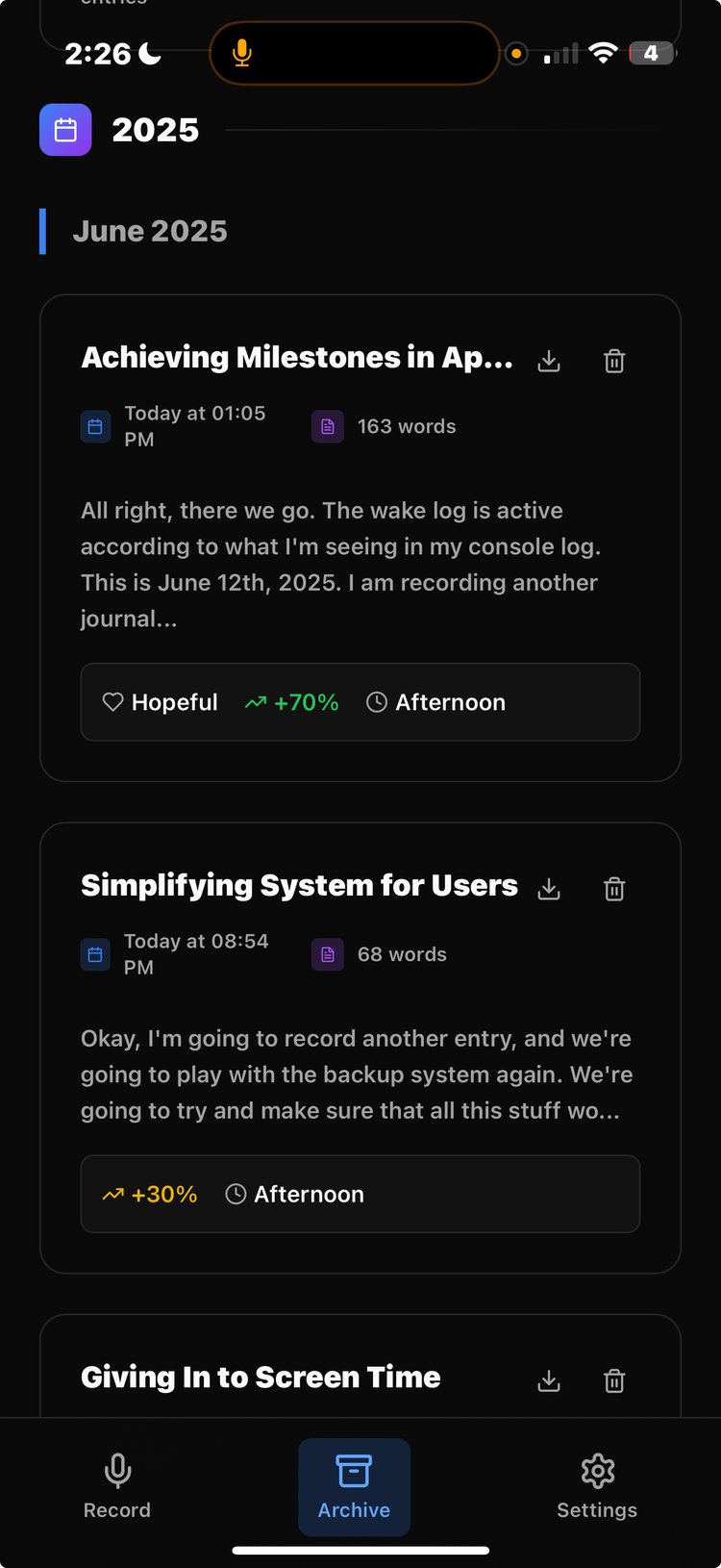 The app focuses on simplicity and privacy. You can record entries on the go, and the AI takes care of the rest: transcription, enhancement, tagging, sentiment analysis, and even smart summaries over time. You can search past entries, attach photos, export to PDF, and switch between local or encrypted cloud storage whenever you want. Everything is encrypted by default using your login password. Bullet proof privacy and security.