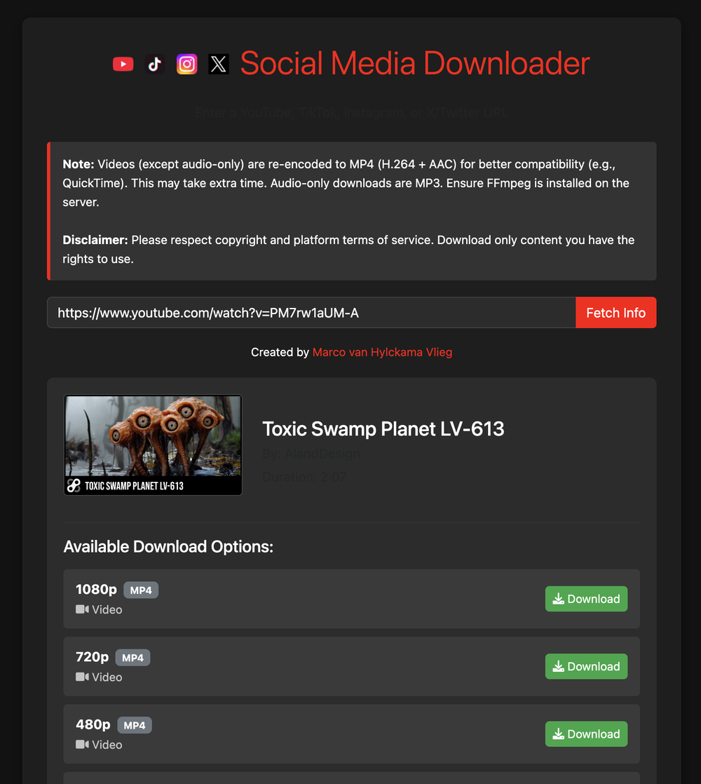 I built this Social Media Downloader to solve a simple but persistent problem: saving content from platforms like YouTube, Instagram, TikTok, and Twitter without jumping through hoops or dealing with sketchy websites. Whether it's a tutorial you want to watch offline, a funny video to share later, or content for a presentation, this tool handles it all in one clean interface.
