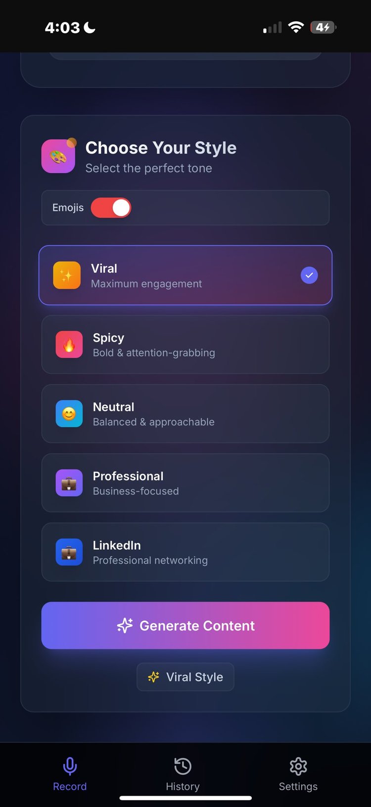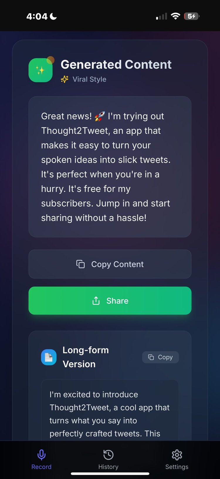 The app streamlines the entire content creation process from thought to post. You record your ideas anywhere, and the AI handles transcription using OpenAI's Whisper, then generates both short-form tweets and long-form content in your choice of style: Viral, Spicy, Neutral, Professional, or LinkedIn. The interface is mobile-first with a sleek dark design, featuring smart wake-lock technology to prevent interruptions during recording, one-tap sharing to any platform, and a complete history of all your generated content stored securely in IndexedDB.