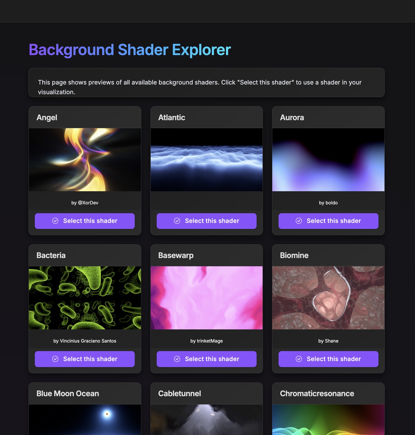 You can layer your visualizer over a static image, a seamless looping video, or elevate it further by pairing it with one of the many built-in high-performance GL shaders. These shaders span everything from abstract particle systems to elegant organic forms—each one designed to bring your audio to life in visually compelling ways.