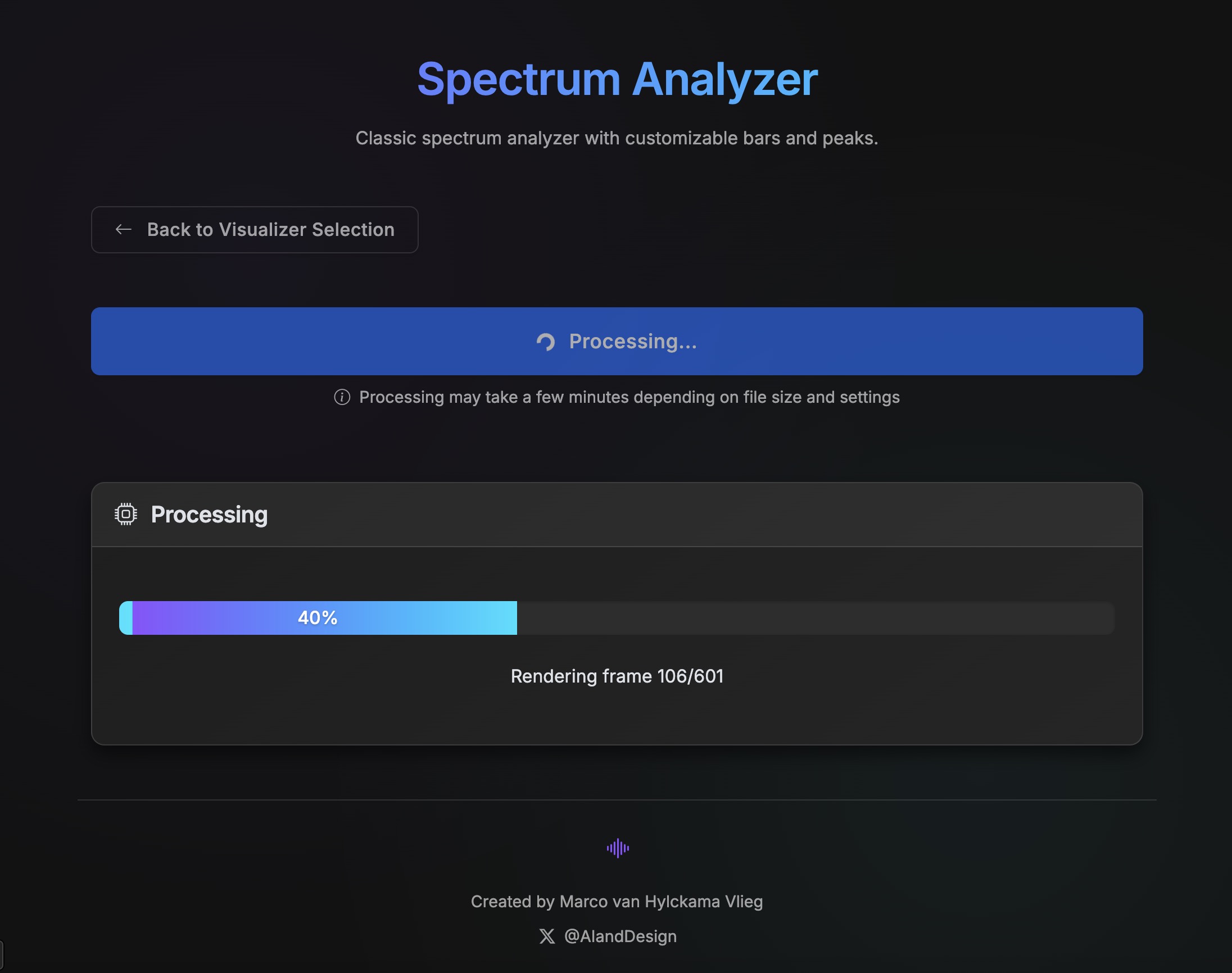 No need for complex editing software. Just load your track, select your style, and render. It's your music, visualized beautifully.